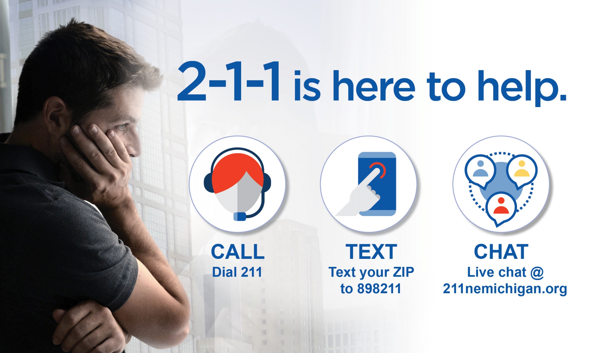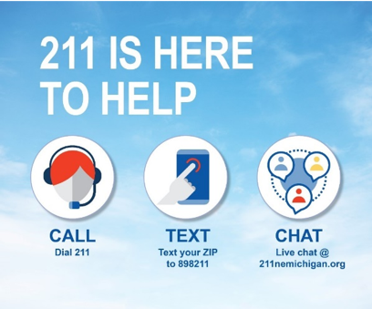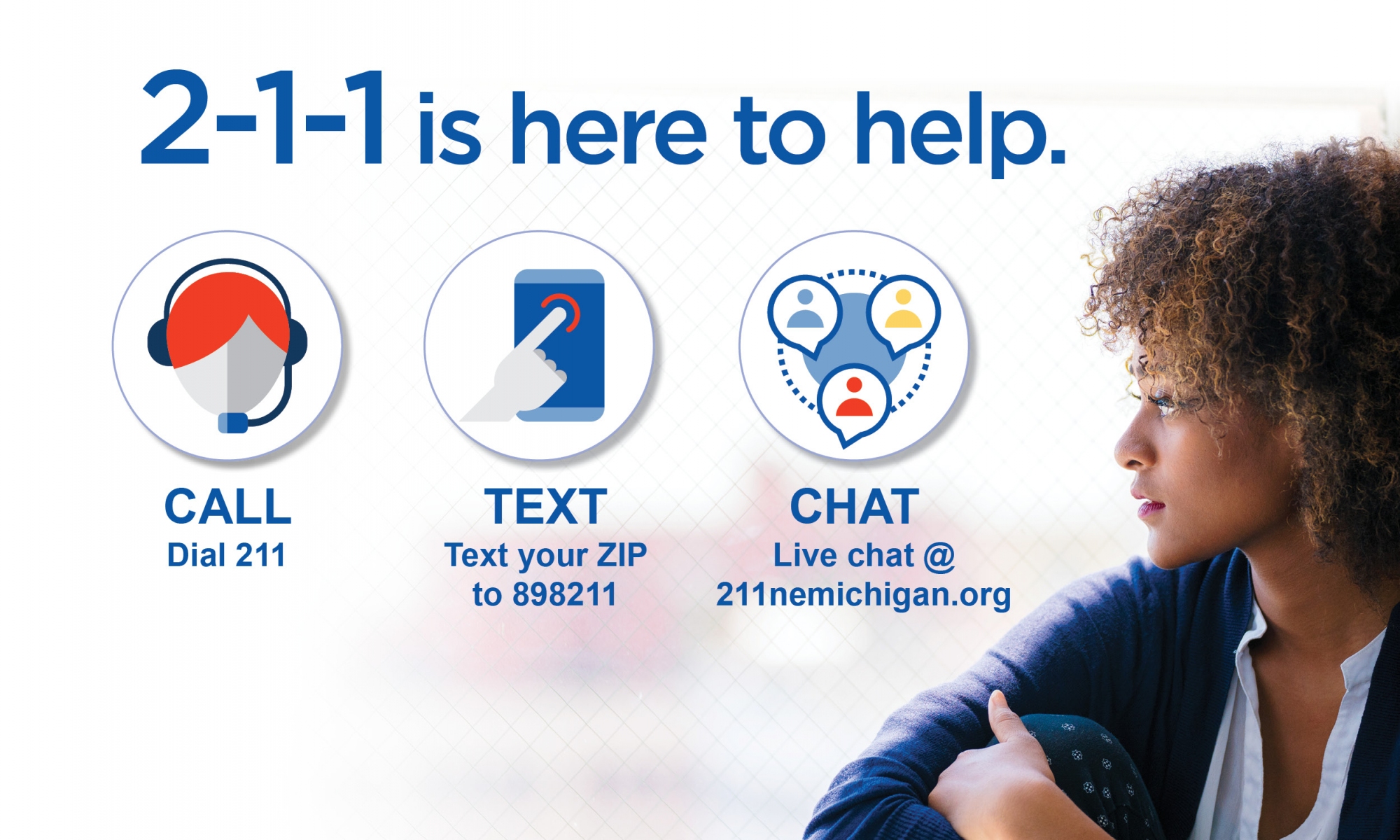In need of meals, clothing, shelter or other essential needs? 2-1-1 is a non-emergency public service number that connects people with local resources. Dial 2-1-1 or visit 211NEMichigan.org to learn more and chat with a live agent.